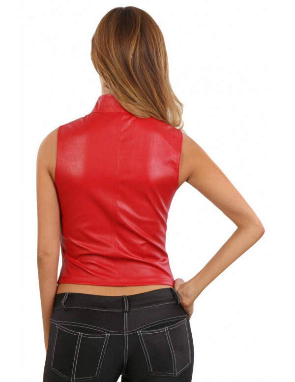 Korte kunstleren top met opstaande kraag. Deze fraai top sluit met een zilvderkleurige metalen rits aan de voorkant.
