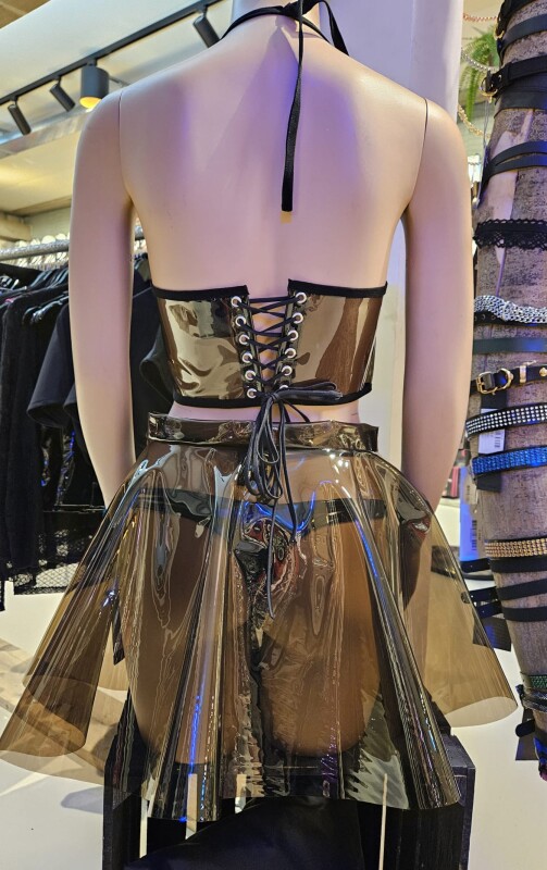 Sexy haltertop gemaakt van transparant vinyl, met zwarte belijning en een zwarte vetersluiting op de rug. door de vetersluitingen (hals en rug) sluit de top altijd mooi aan.