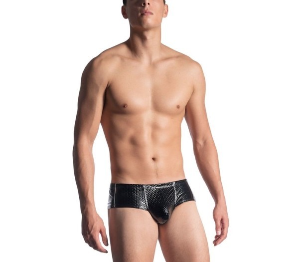 Heupslip van zwarte lakstof met reliëf.