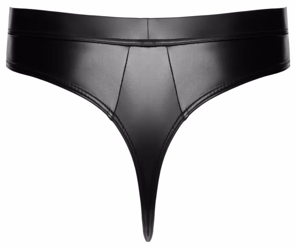 Snelle string van Svenjoyment in een zwarte wetlook met rode contrasterende strepen die de rits aan de voorkant stijlvol omlijsten. Zacht en elastisch rondom en met een bedekte elastische tailleband voor maximaal comfort.