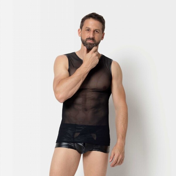 Adriaan is erg sexy! Deze recht gesneden tanktop is gemaakt van zwart mesh. Een wetlook rand omrandt de halslijn en armsgaten en is aan de zijkant verfraaid met een gegraveerde plaquette.