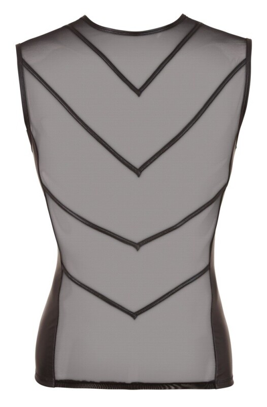 Top Carl: Wetlook achterkant en transparante mesh voorkant welke is verfraaid met smalle opgestikte wetlook-strepen. De smalle halslijn rondt de extravagante look perfect af. Met deze nauwsluitende top slaat u altijd een goed figuur - zelfs in een grote maat!