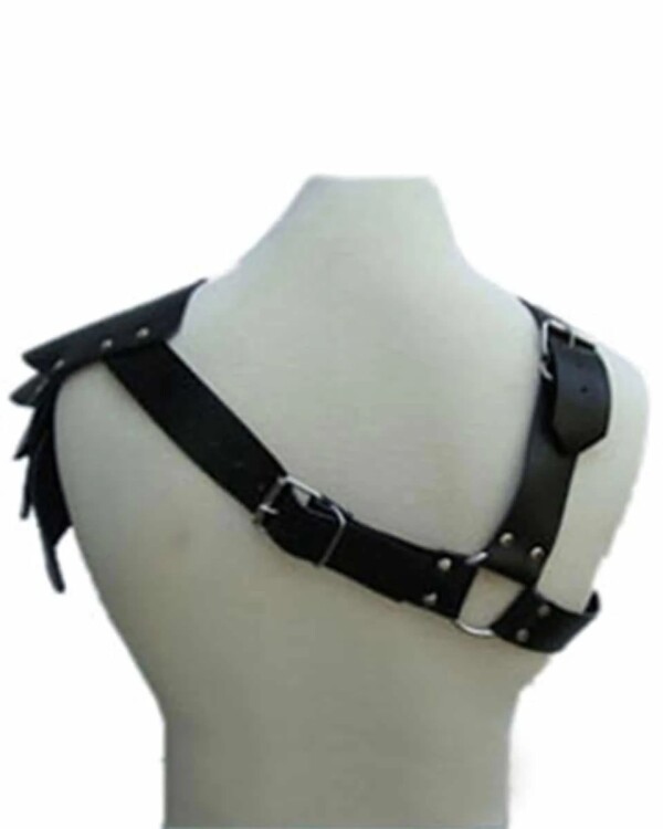 Stoer leren schouderharnas, met brede leren banden over de borst en een fraaie leren geschubde schouderpartij.