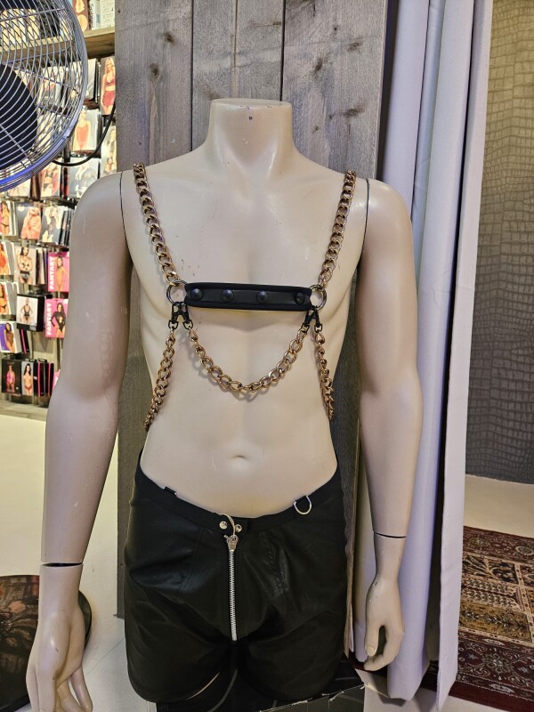 Basic harnas gemaakt van neopreen banden met daaraan bevestigd bronskleurige aluminium kettingen.