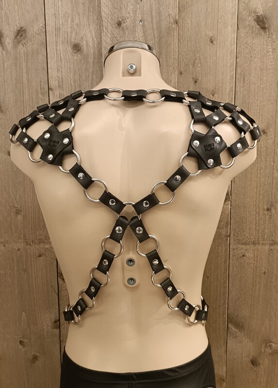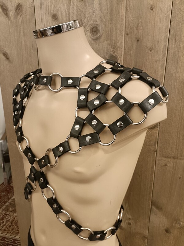 Het ontwerp geeft je lijf een stoere uitstraling. Dit harnas heeft geen halsringen waardoor het een gevoel van vrijheid geeft. Door de verstelbare sluiting ben je verzekerd van een goede pasvorm.