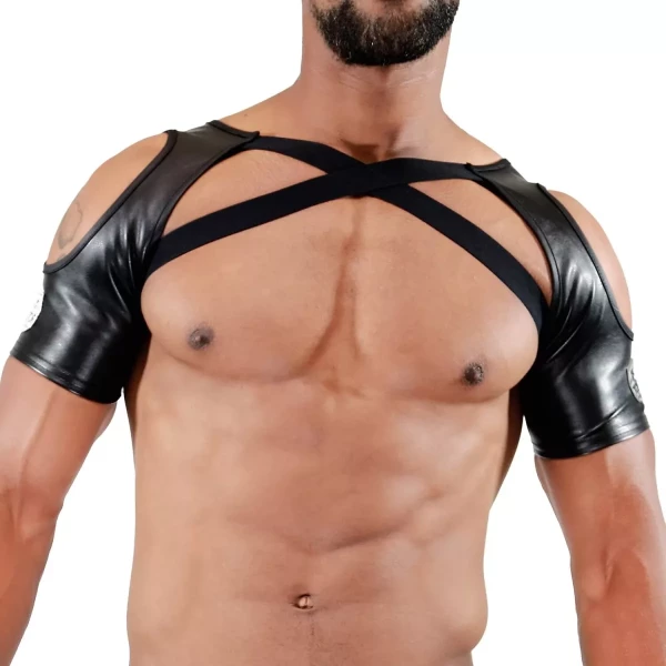 Schouderharnas gemaakt van soepel kunstleer met elastische banden. Dit originele accessoire is rechtstreeks geïnspireerd op de outfits van gogodansers en gladiatoren. Het is ontworpen voor clubbezoek. Dit harnas omarmt de geest van klassieke harnassen, waardoor het lichte en elegante kledingstukken zijn.