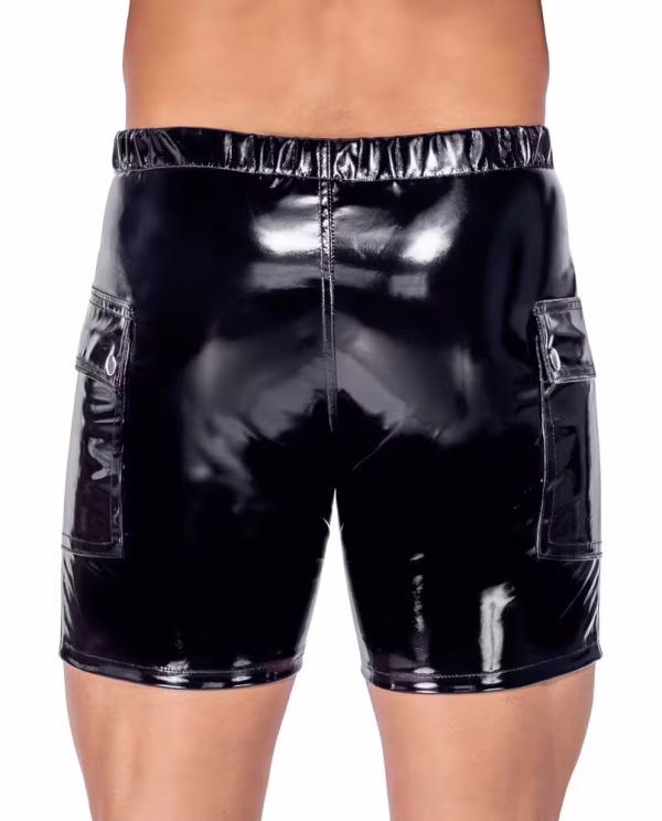 Glimmend zwart, licht elastisch vinyl short van Black Level met een onderliggende ritssluiting in de buidel. Eén opgestikte klepzak aan elke kant met zilverkleurige drukknopen. Casual, comfortabel model met elastische tailleband achter voor een perfecte, comfortabele pasvorm.