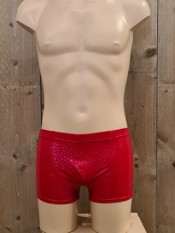 Nauw aansluitende boxer gemaakt van rode lak met een hologram print. Zonder rits.