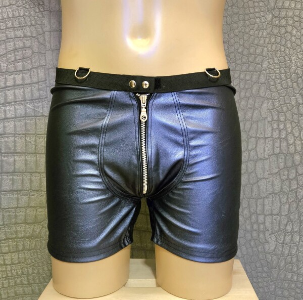 Stoere kunstleren korte broek met een iets langer pijpje dan gebruikelijk, gemaakt van metallic blauw kunstleer. De broek heeft een zilverkleurige metalen rits aan de voorkant.