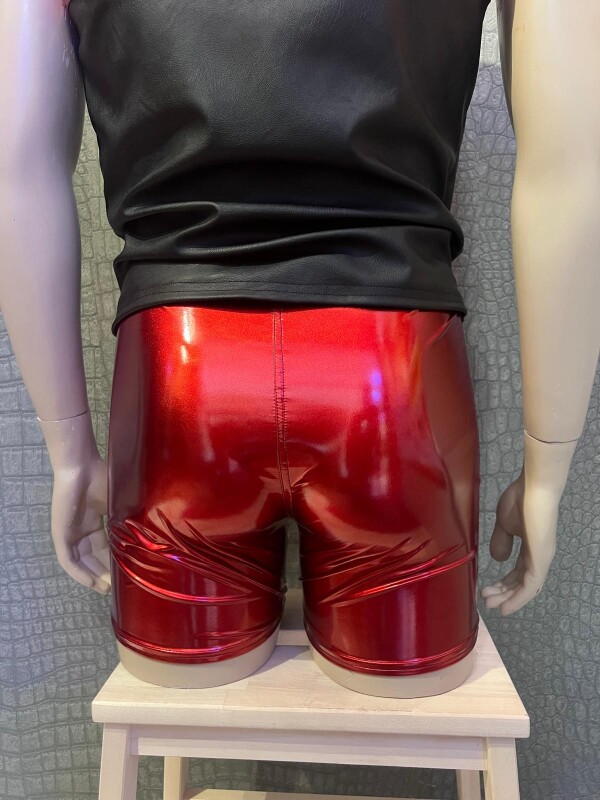 Sexy short van metallic rood lakmateriaal met een zilverkleurige metalen rits.