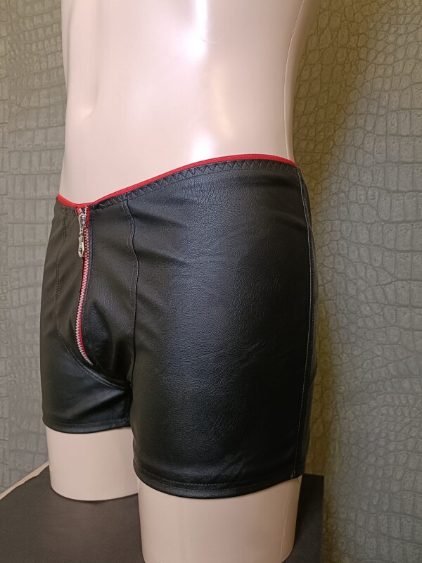 Mooie shorts in zwart kunstleer met een rode bies langs de zilverkleurige metalen rits en langs de heupen.