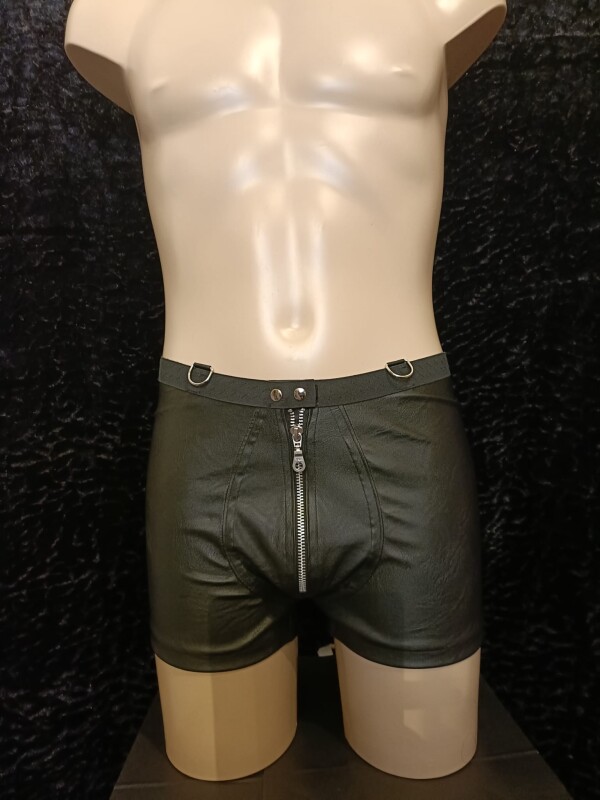 Zwarte kunstleren shorts met een zilverkleurige rits aan de voorkant. Op de heupen en achterop een ringetje, waar je eventueel bretels aan vast kan maken.