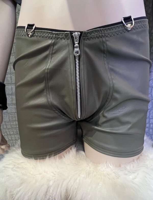 Stoere korte broek gemaakt van legergroen kunstleer met een zilverkleurige metalen rits.