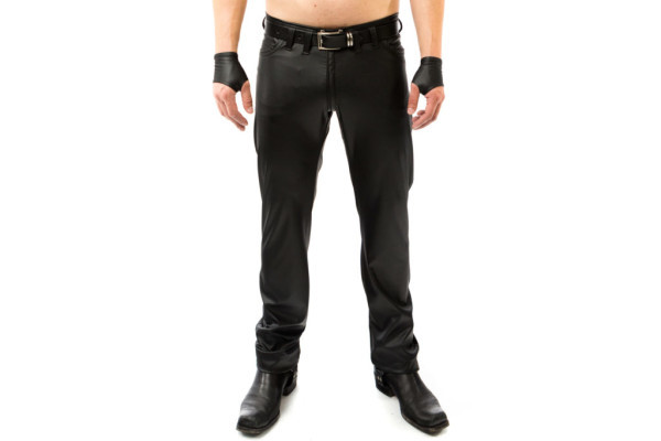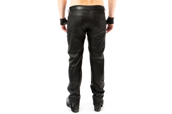 Kunstleren jeans, heupmodel. Met rits, riemlussen en voor- en achterzakken.
