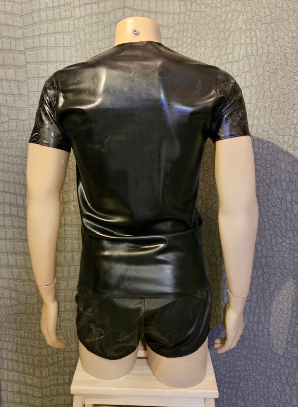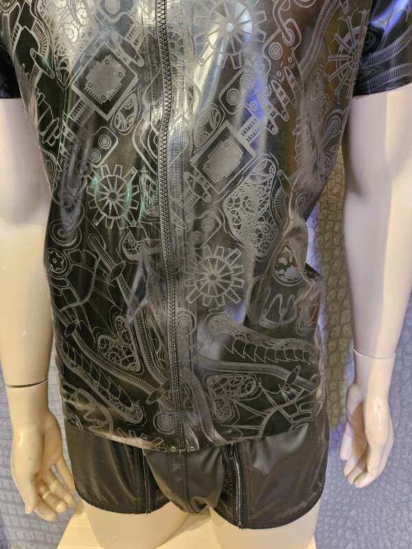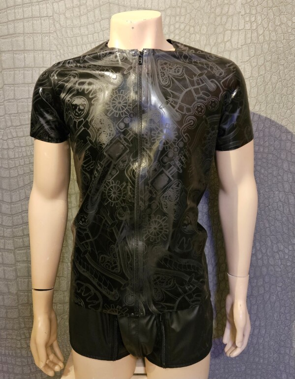 Latex top met korte mouwen en een ronde hals. Gemaakt van zwarte latex met voorop een industriele print.