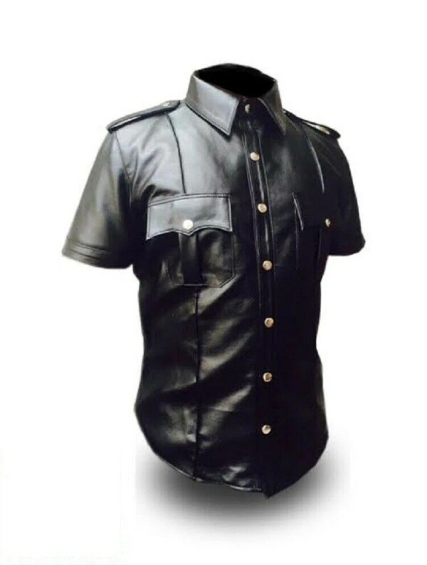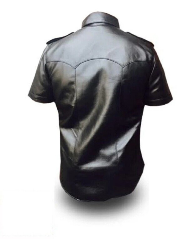 Mooi zwart leren overhemd in politie stijl. Gemaakt van zacht soepel schapenleer. Met stevige kraag en korte mouwen met epauletten. Sluit met zilverkleurige drukkers.