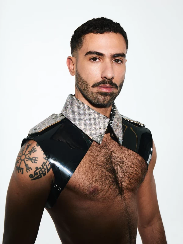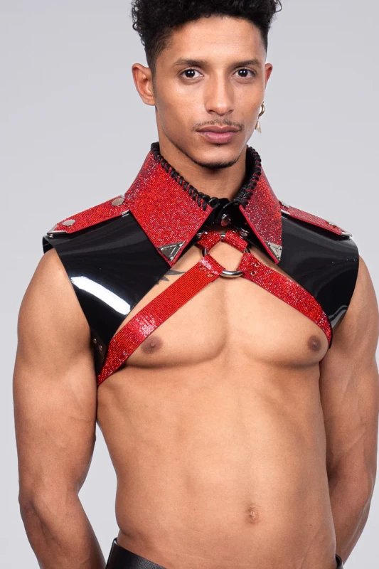 Vinyl schouderharnas met een opvallende crystal kraag en epauletten. Het harnas is aanpasbaar middels grote metalen gespen onder de armen. Het sluit met een drukker in de hals