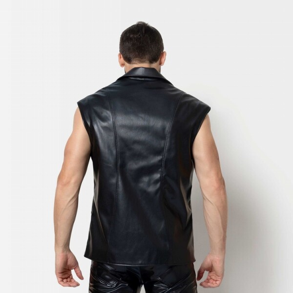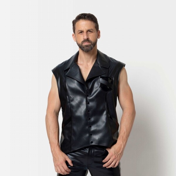Stoer kunstleren gilet met kleine kapmouw en fraaie lakaccenten. Sluit met drukkers.