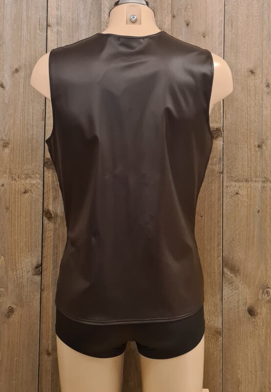 Bruine kunstleren mouwloze top met prachtig croco-dessin op de voorpanden. Deze top sluit met een kunststof rits aan de voorkant.