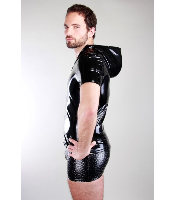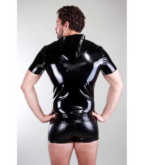 Nauw aansluitende lak top met korte mouw en capuchon. Deze top is gemaakt van elastische zwarte lak en heeft een bijzondere rits.
