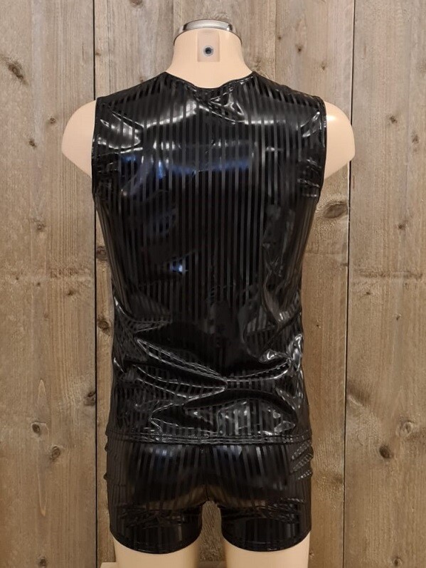Mooie mouwloze top met rits, gemaakt van hoogglanzende zwarte lak met een antraciet kleurig streepje.