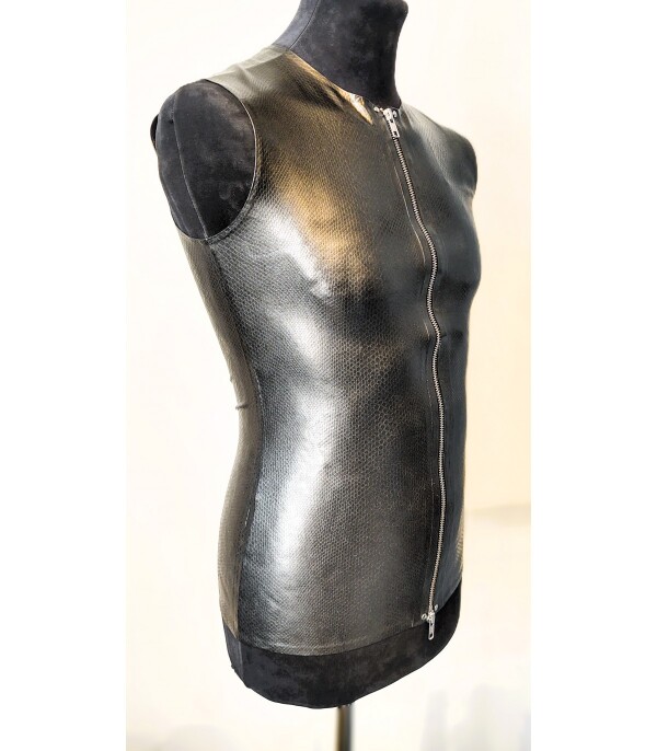 Prachtige zilverkleurige mouwloze latex top met een subtiele slangenprint. Deze mooie top sluit met een metslen rits aan de voorkant.