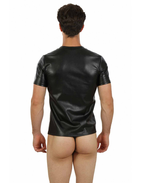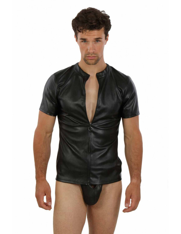 Kunstleren top met een ronde hals, korte mouwen en een lange zwarte metalen rits aan de voorkant.