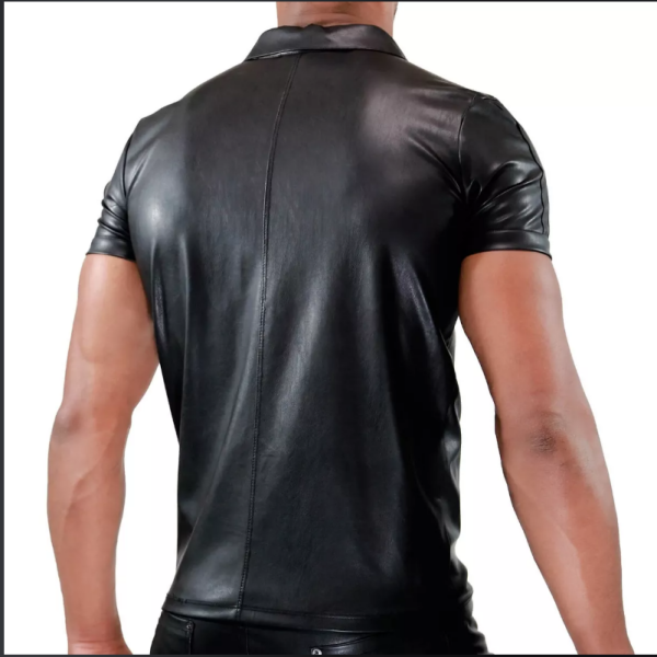 Stijlvolle kunstleren polo met korte mouw en 2 knoopjes in de hals.