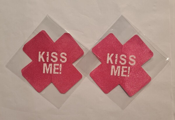 Kruisvormige set roze tepelstickers voor eenmalig gebruik met de tekst " kiss me".