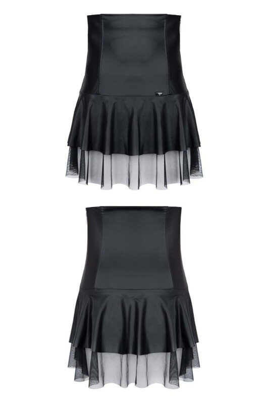 Sexy mini rok van elastisch wetlook materiaal en tule, met verstevigde hoge taille en extra ritssluiting. De kunststof baleinen creeeren een mooie taille en zorgen er tevens voor dat de bovenkant van het taille stuk niet omrolt.