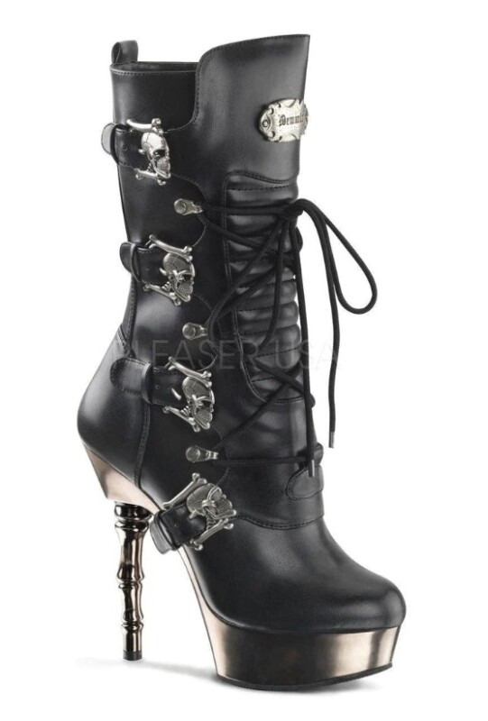 Halfhoge laars gemaakt van kunstleer met een spectaculaire bot-vormige hak en fraaie schedelvormige gespen.