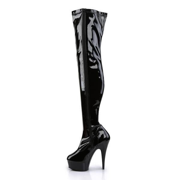 Elegante overknee laarzen met plateau een lange ritssluiting aan de zijkant en een sexy naaldhak. Gemaakt van zwart stretchlak. Hakhoogte 15 cm, plateauhoogte 4.5 cm.