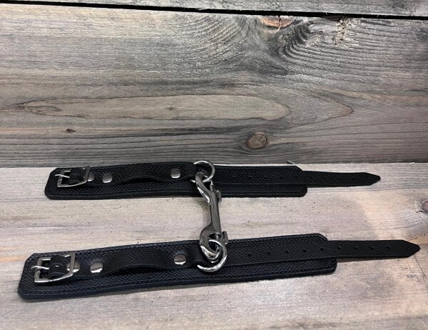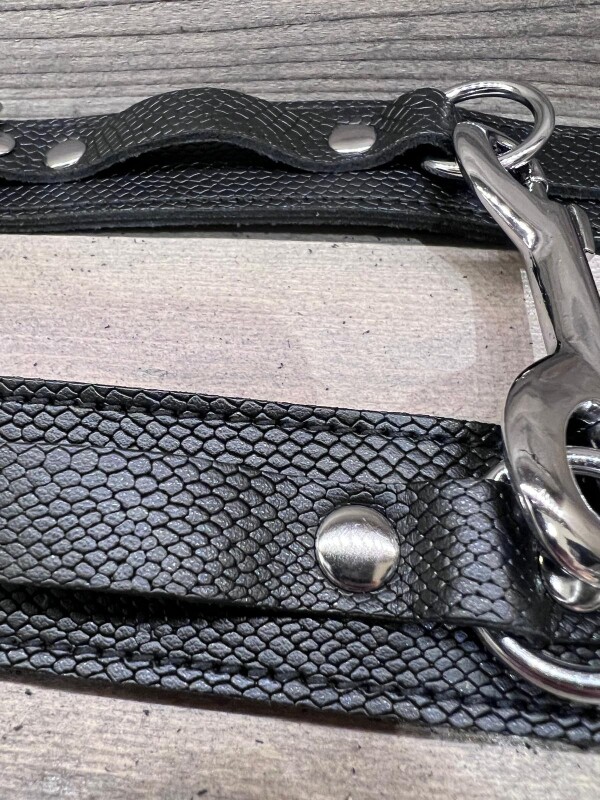 Polsboeien gemaakt van zacht maar stevig zwart leer met een 3-D slangenprint patroon. 3,5 cm breed en voorzien van een stevige metalen D-ring. Een karabijnhaak wordt meegeleverd. Handgemaakt.