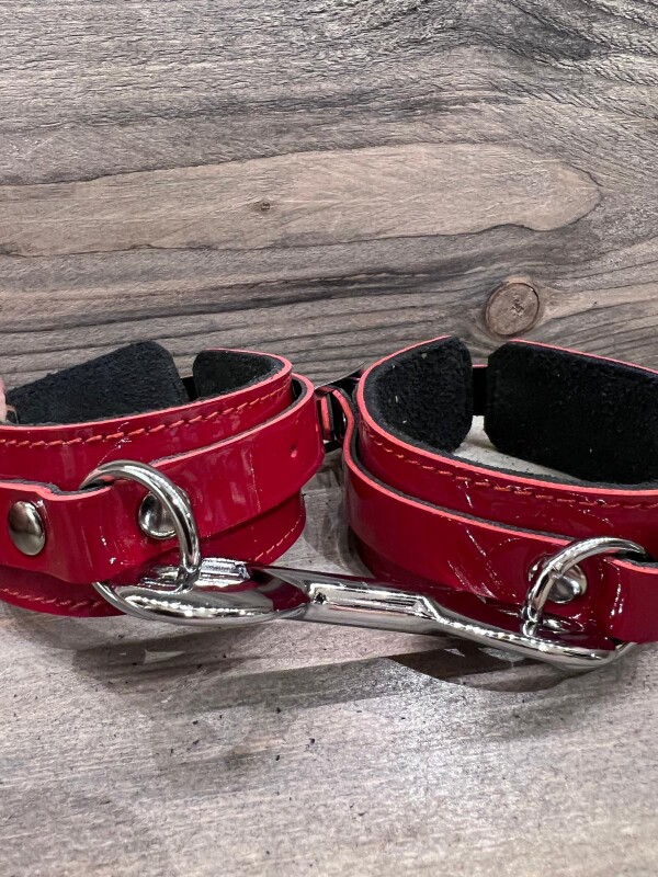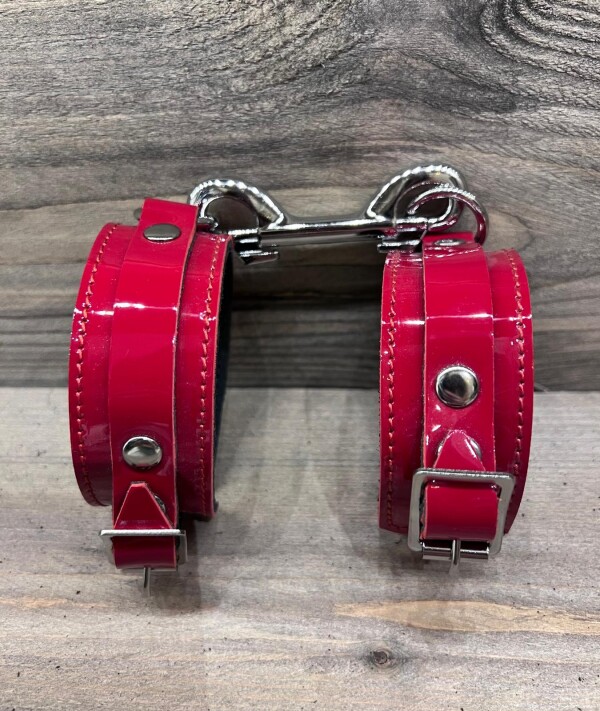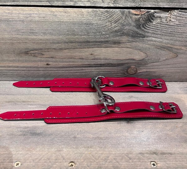 Polsboeien gemaakt van leer met een dieprode lak finish. 3,5 cm breed en voorzien van een stevige metalen D-ring. Een karabijnhaak wordt meegeleverd.