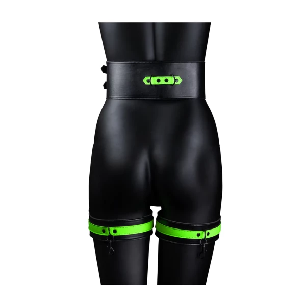 Dijboeien Set Glow-in-the-dark. Het design heeft het autentiek bondage uiterlijk, maar brengt licht in het duister door zijn fluoresecrende groene details waardoor alles een feest wordt. De prachtige dijmanchetten worden gebruikt om extra bewegingsbeperkingen toe te voegen waar en wanneer dat nodig is. De riem geeft biedt eindeloze mogelijkheden om te gebruiken samen met andere bondage items. BDSM spelletjes zagen er nog nooit zo mooi en sexy uit! Ouch! Glow-In-The-Dark producten moeten worden geactiveerd met het zonlicht voordat je er in het donker van kunt genieten.