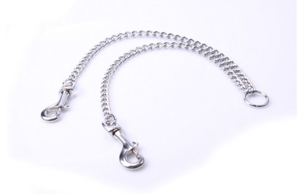 Verbindingsketting met grove schakels, voorzien van een musketon haak aan ieder uiteinde en een ring in het midden.