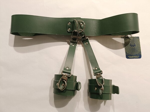 Prachige bondage gordel van groen leer in de maten S/M en L/XL