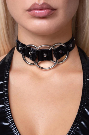 Creëer de ultiemelook met onze Dominatrix-choker. Met drie zilveren O-ringen die in het midden met elkaar verweven zijn en een verstelbare gespsluiting voor een perfecte pasvorm, is dit accessoire ontworpen om elke rave-stijl aan te vullen.