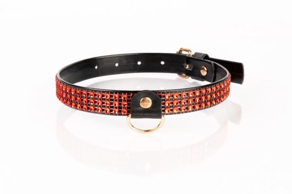 Smalle zwarte vegan collar met gekleurde strass en een D-ring aan de voorkant. Aan de achterkant een metalen gesp.