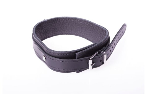 Leren collar gemaakt van sterk en soepel zwart leer. Fijne basic collar voor beginners en ervaren dragers. Breedte 38 mm. Deze spannende halsband heeft een stevige D-ring voorop en sluit met een metalen gesp.