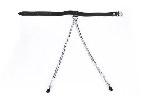 Lederen collar met tepelklemmen aan kettinkjes. De klemmetjes zijn niet verstelbaar en hebben een rubberen tip zodat ze comfortabel dragen.