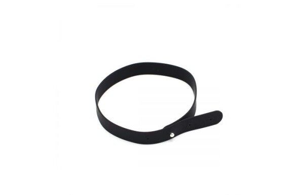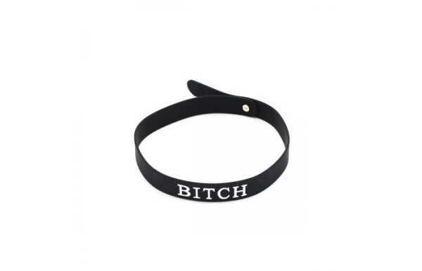 Smalle zwarte siliconen collar met in witte letters BITCH. Deze collar sluit aan de achterkant met een metalen bolletje