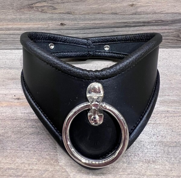 V-vormige leren collar. Gemaakt van soepel zwart leer met omgezoomde bies, voor optimaal draagcomfort. Deze collar heeft een grote metalen o-ring aan de voorkant.