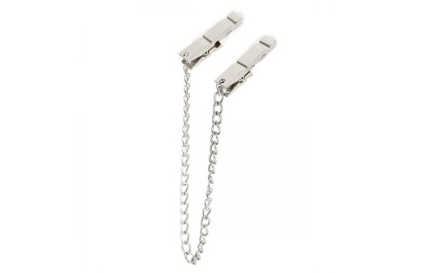 Verzinkte tepelklemmen in wasknijpervorm verbonden met een metalen schakelketting. Elke klem heeft een lengte van 5 cm, de ketting daartussen is 31 cm.