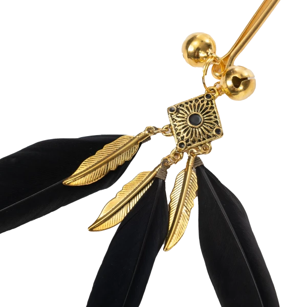 - Versierd met belletjes en een ornament met kleine gouden en grote zwarte veren