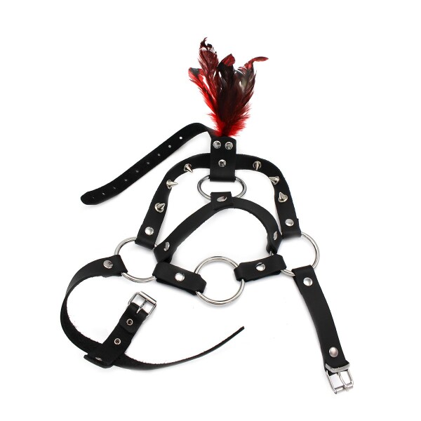 Hoofdharnas van leer met O-ring Ø 45 mm. Verfraaid met puntige studs en rode sierveren. Eén maat verstelbaar door middel van een gespsluiting