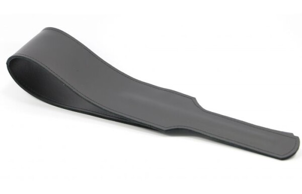 Brede leren paddle met dubbel slagstuk. Gemaakt van stevig echt leer. De handgrepen zijn inwendig versterkt, voor een goede grip. Totale lengte 84 cm, dubbel gevouwen 42 cm. Breedte van het slagstuk 7.5 cm. Breedte van de handgreep 4 cm.