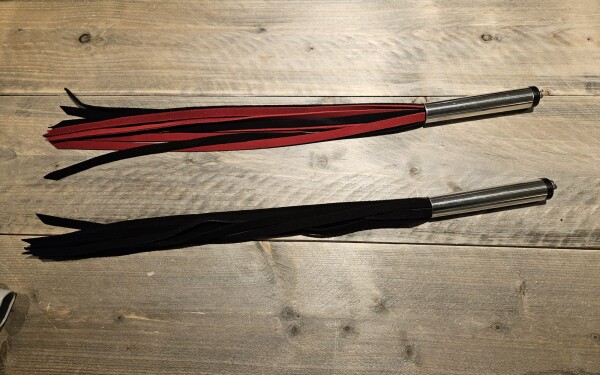 Handgemaakte leren flogger, gemaakt van soepel suede met een metalen handvat. Totale lengte 60 cm, waarvan het handvat 13 cm is.
