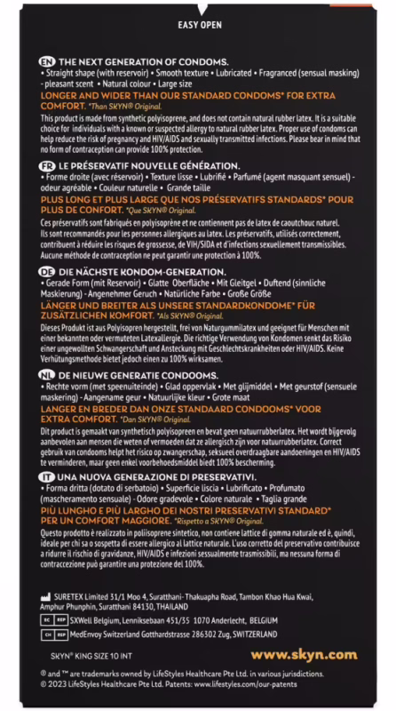 De transparante, vochtige, ultradunne Manix SKYN King Size condooms zijn extra groot met een lengte van 190 mm (meestal 180 mm) en een nominale breedte van 56 mm (meestal 52 mm). Het polyisopreen materiaal van de condooms heet Skynfeel en is zachter en elastischer dan latex, maar net zo stabiel en zonder de klassieke latexgeur. Het is daarom ideaal voor mensen met een latexallergie. Veganistisch.
