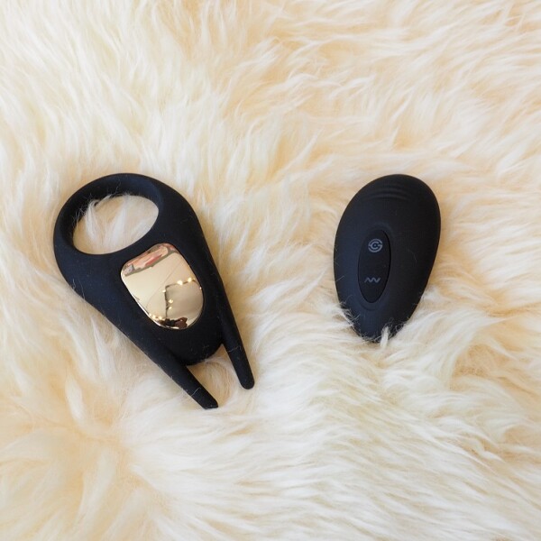 Spannende vibrerende cockring in fluweelzachte zwarte siliconen met goudkleurige accenten.